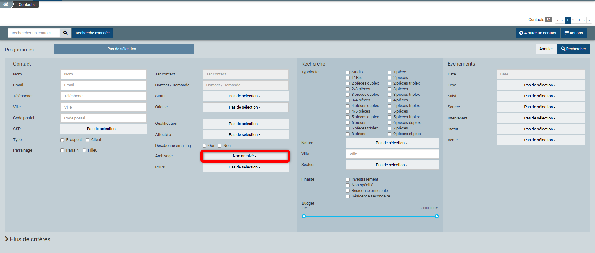 Lorsqu’un client acquéreur n’a plus lieu d’exister dans la liste des contacts actifs, par exemple parce que son projet immobilier a abouti (vente finalisée) ou abandonné, il est conseillé d’archiver la fiche contact (au lieu de la supprimer définitivement)