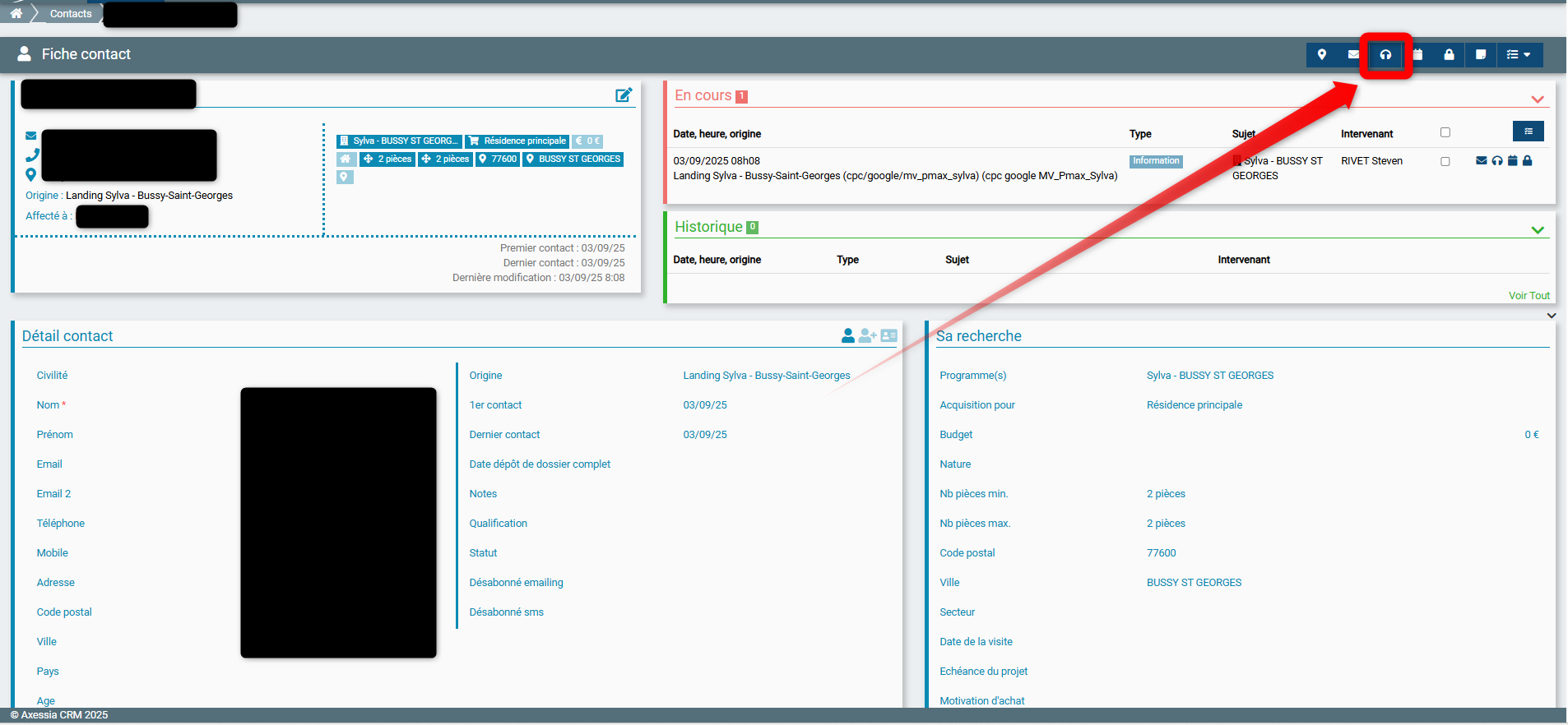 Pour renseigner un appel/sms, accéder à la fiche du contact :