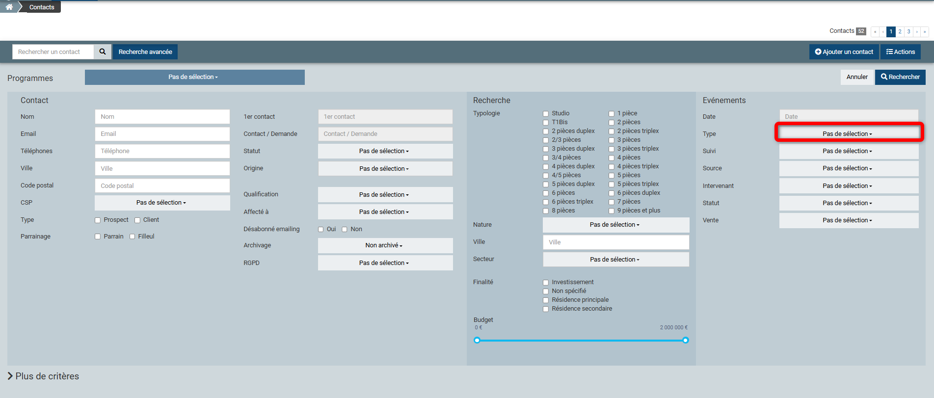 Menu principal > Contacts > Recherche avancée > Faire un choix dans la zone «Type» et lancer la recherche en cliquant sur « Rechercher »