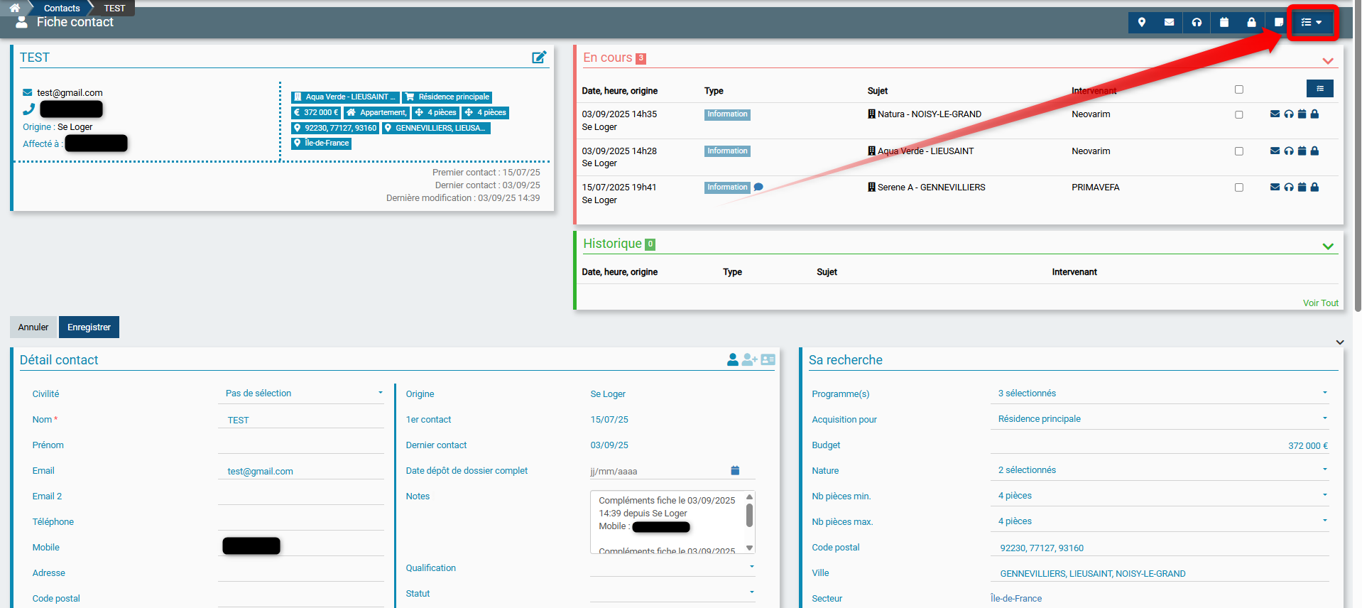 – Fusionner la fiche contact avec une autre : Plus d’informations dans l’article « Fusionner des contacts »