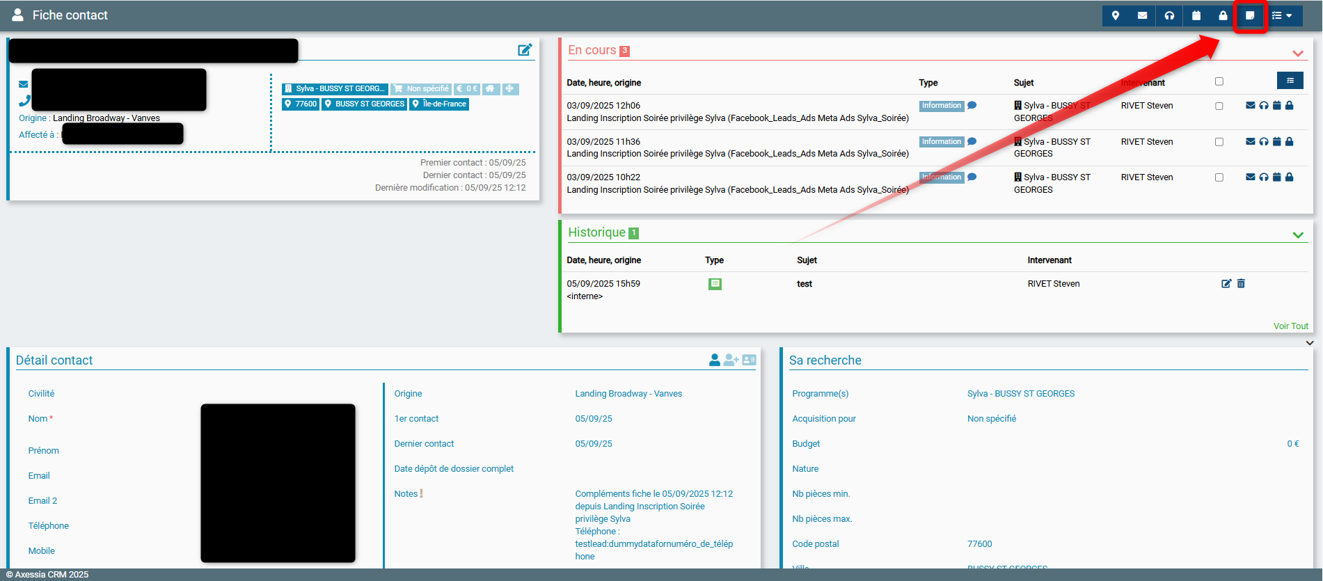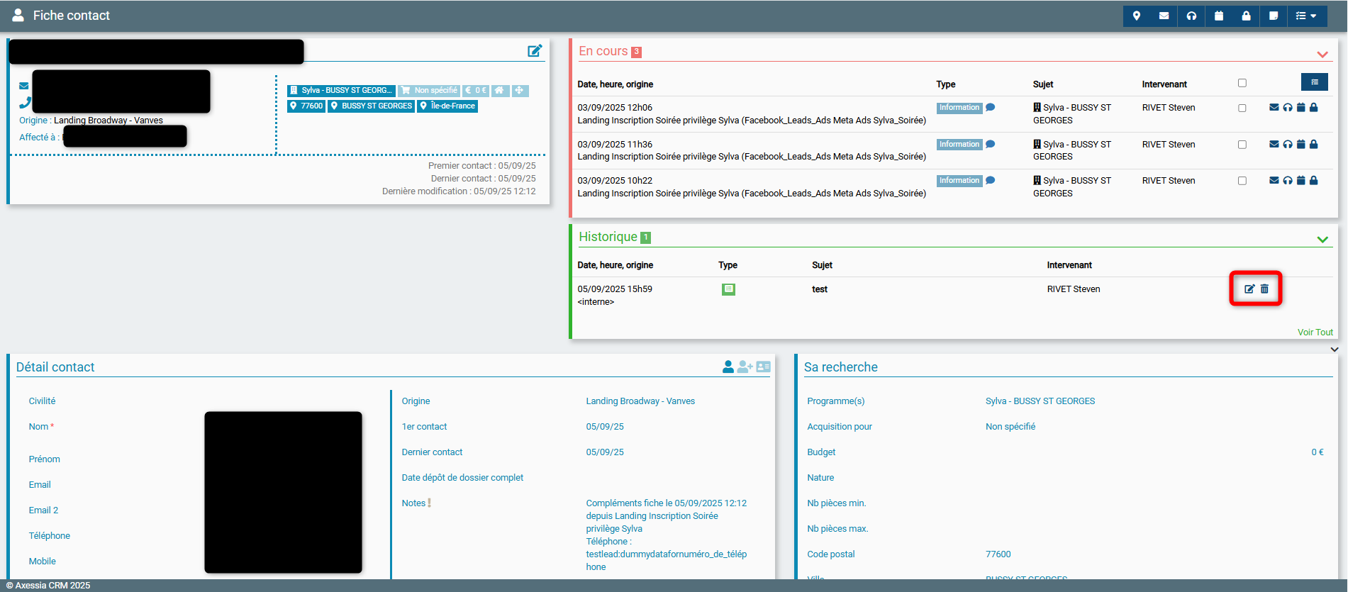 Tous les événements de type « note » (même ceux ayant une date future) sont classés dans la zone « Historique » de la fiche contact, où sont listés tous les événements traités du contact : Ouvrir la zone « Historique » en cliquant sur la flèche relative, survoler une note, et cliquer sur le pictogramme « crayon » pour modifier les informations relatives ou sur le pictogramme « poubelle » pour supprimer la note.