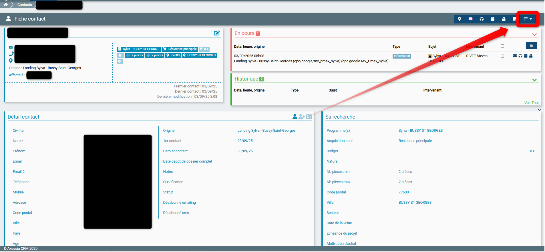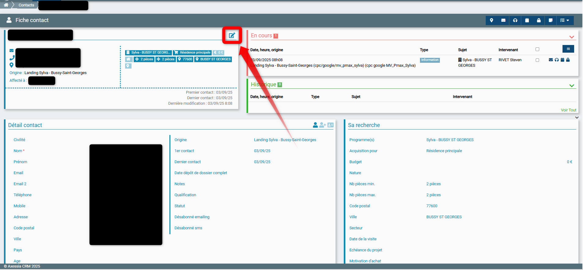 Contacts > Cliquer sur le nom du contact > Cliquer sur le pictogramme « crayon » en haut de page à côté du nom du contact :