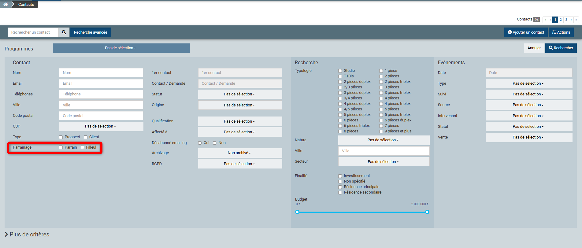 La recherche avancée des contacts permet de retrouver les contacts déclarés comme parrains ou filleuls :